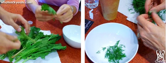 First, Chef Pagonis started on the Kolokithokeftedes or zucchini fritters. He cut and grated the fresh zucchini, noting that using the medium-tooth of a box grater was easiest. Then, he cooked the zucchini on high heat for a few minutes just to draw out most of the water. He drained the zucchini and set it aside to cool. He then made Tzatziki by mixing shredded cucumber into fresh thick Greek yogurt seasoned with dill, garlic, salt, lemon juice, and olive oil. This simple and delicious dip would be the base for our zucchini fritters. Later, Chef Pagonis returned to the shredded zucchini and added in scallion, cheese, egg and panko bread crumbs for binding. He hand-mixed and rolled out little fritters for frying. The kolokithokeftedes were my favorite - the perfect mix of vegetables and cheese, all punched up in flavor by the mint and dill herbs.Check out my Kolokithokeftedes recipe.